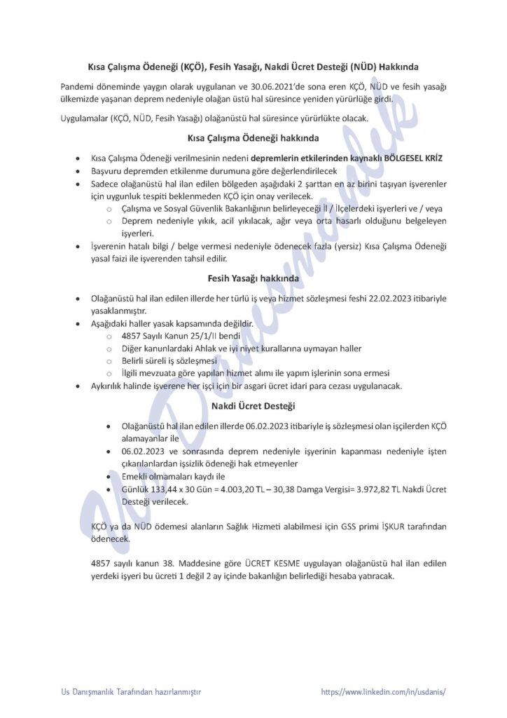 Pandemi döneminde yaygın olarak uygulanan ve 30.06.2021’de sona eren KÇÖ, NÜD ve fesih yasağı ülkemizde yaşanan deprem nedeniyle olağan üstü hal süresince yeniden yürürlüğe girdi. Uygulamalar (KÇÖ, NÜD, Fesih Yasağı) olağanüstü hal süresince yürürlükte olacak.